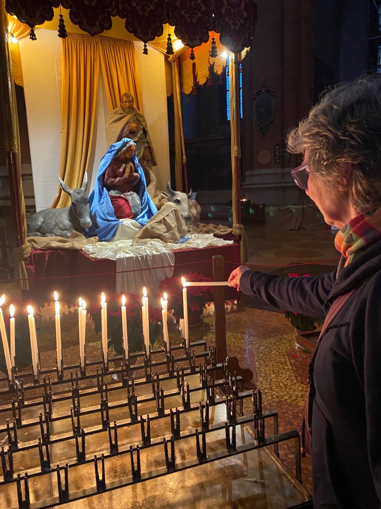 It’s Advent, so a Nativity scene of the Holy Family sits under a lit canopy in the Basilica of San Petronius in the heart of Bologna. Libby lights a half-euro candle there, a practice she’s adopted for our daughter’s passing two years ago. I wander to the other side, crossing unaware a meridian line that a 17th century astronomer made on the marble floor to trace the path of a ball of light from the noontime sun. But it’s dark now, a late December afternoon.