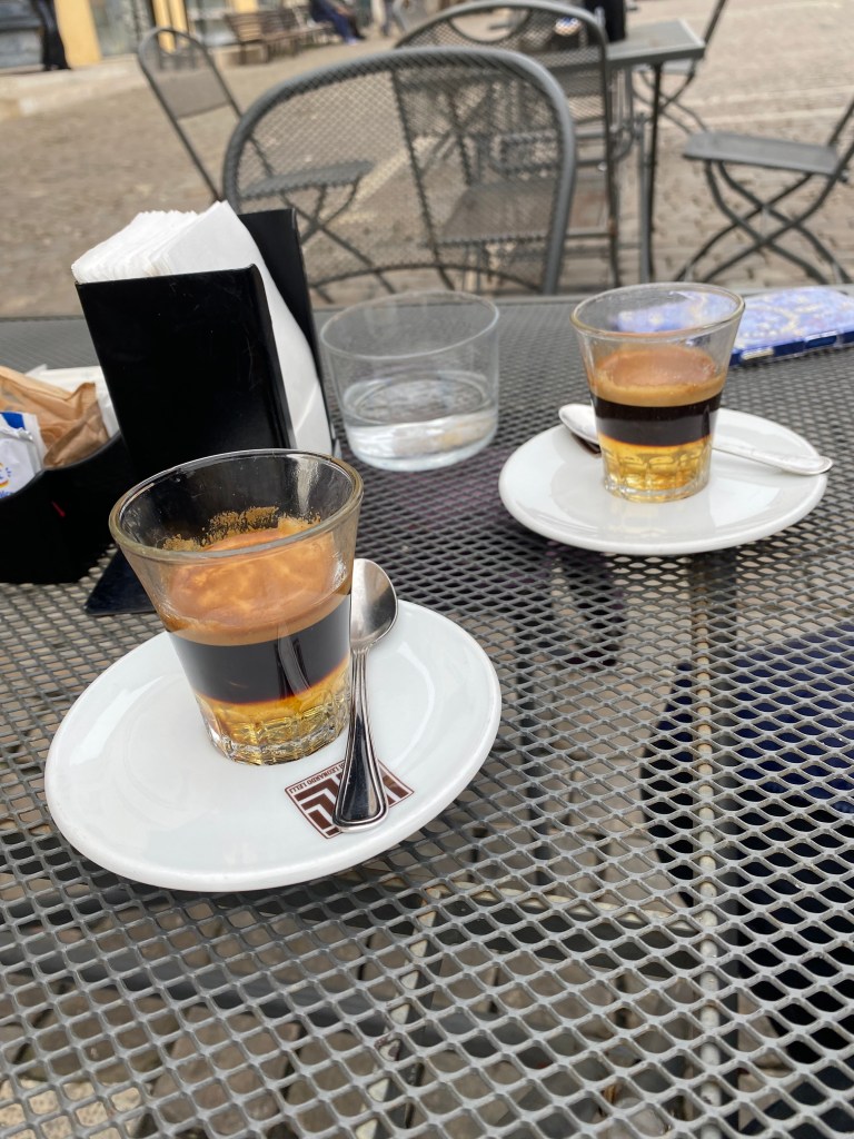 The coffee drink is called a moretta. They say it was invented by the Fano fishermen to keep them warm and energetic on chilly days like this out on the water. It is served hot in little glasses that show its three layers – foamed cream on top, espresso coffee in the middle, and a mix of cocktails on the bottom. Typically, this is rum and brandy with anise. You mix it with a little spoon, then drink.
