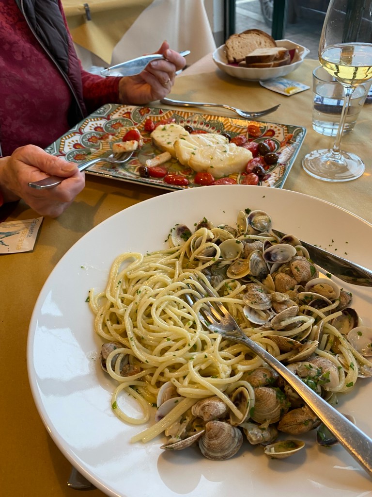 In Fano now, I again ordered spaghetti con vongolo e basilico, at Ristorantino da Santin, which faces the pebbly beaches of Fano just across the Viale Adriatico.