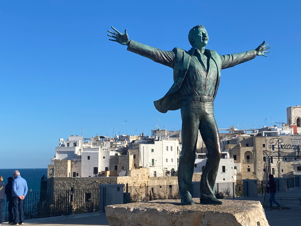 In the daylight, on the opposite cliff, is a piazza where we had a good lunch. The bronze sculpture watching us seem to invite a passion for giving oneself over to the blue sky and blue sea. In fact, it is the figure of Domenica Madugno, a singer from this very town who made famous his song “Volare,” which is about a dream of “blue painted blue.”