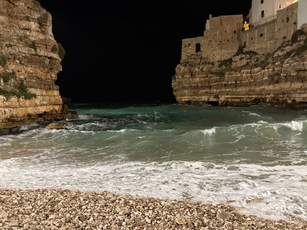 The Adriatic comes thrashing into a canyon of high rock walls at Polignano a Mare.