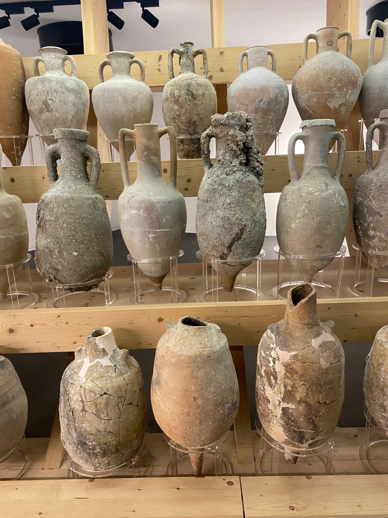 The ship containers were mostly amphoras, those bulbous vases that seem so inconveniently shaped. We’re taught that the pointed bottom is for sticking in the desert sand. But around the rocky Mediterranean, the shape was because amphoras could be stacked in a ship’s hold, side by side and in layers. Hundreds of these are in the museum, along with beautiful Greek vases, Iron Age hardware and other plunder from the sea floor.