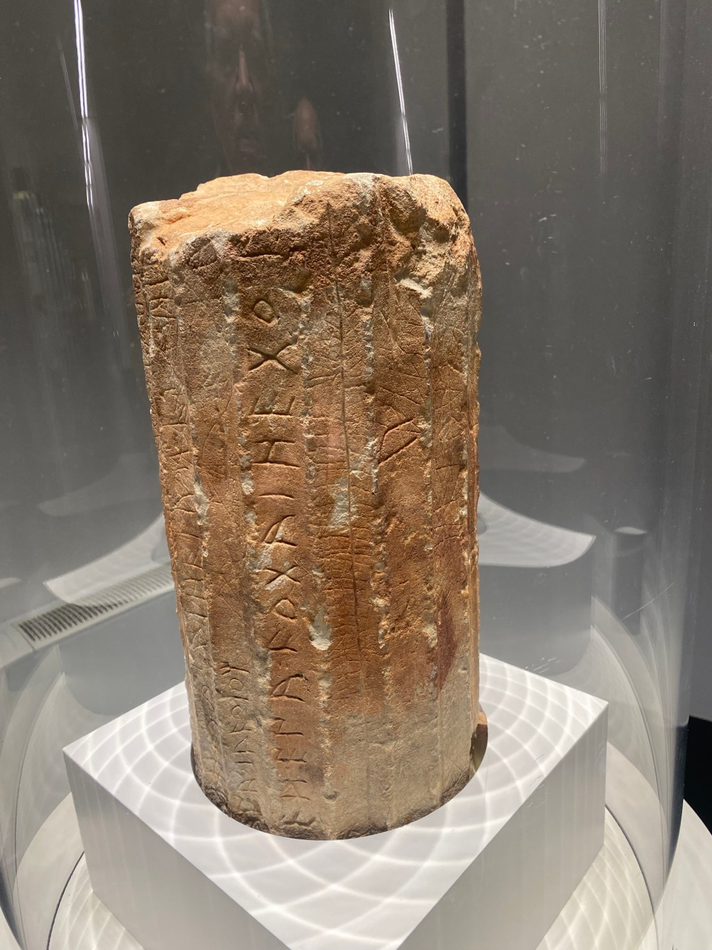 The top of the museum’s spiral had one final display, a column with one of these “alphabeteries” encased in glass. It was originally found in the tiny promontory at the southern tip of Italy’s bootheel, a town called Patù. If “Mediterranean” means middle of the earth, Patù must be the middle of that, and the middle of Time.