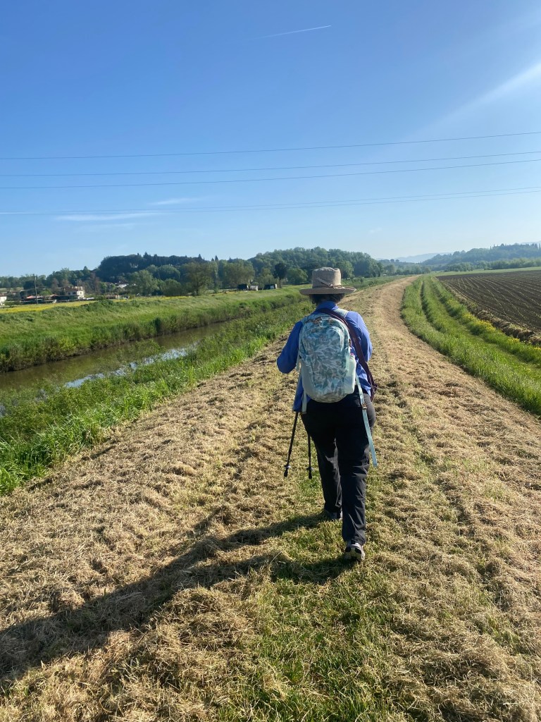 We are two pelligrini, daypacks on backs, knitting the ground with adjustable walking poles bought outside Lucca. Fueled by a hotel breakfast and two cappuccinos each. CaminoWays, a service company that supports self-guided tours like ours, is invisibly hauling a heavy suitcase from one hotel to the next.
