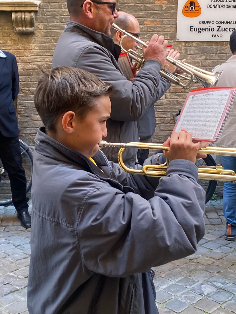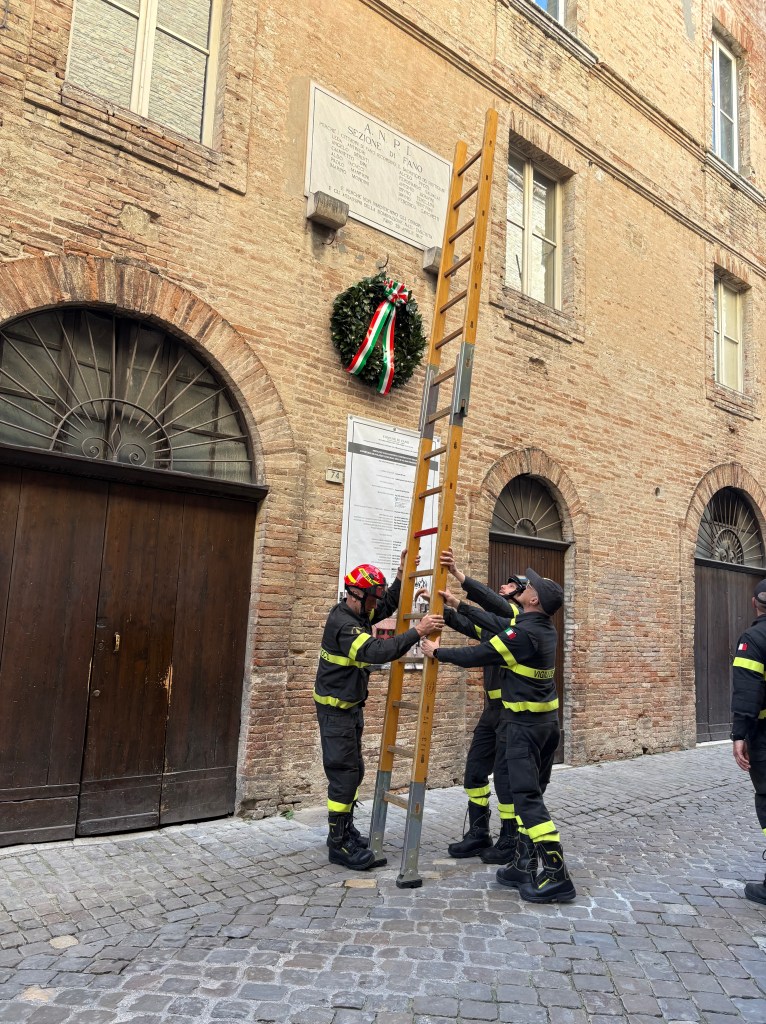 On the cobblestone street where we stood, a 50ish firefighter climbed a wooden ladder to hang a laurel wreath on the Mayor’s residence, the main municipal office of Fano.