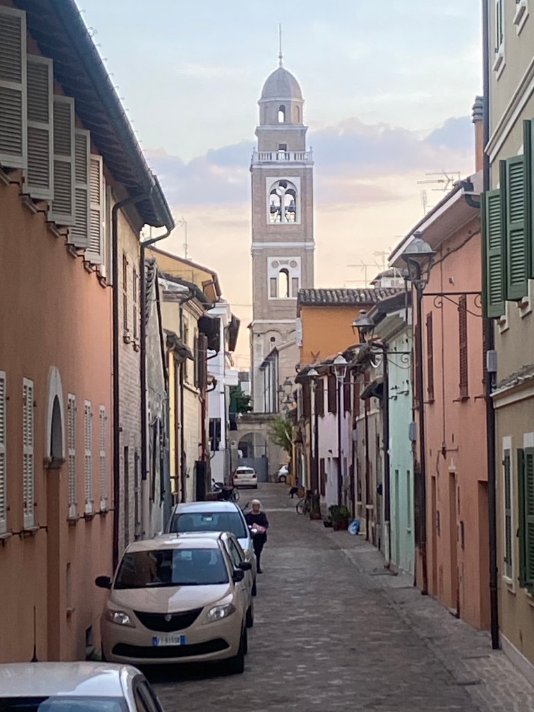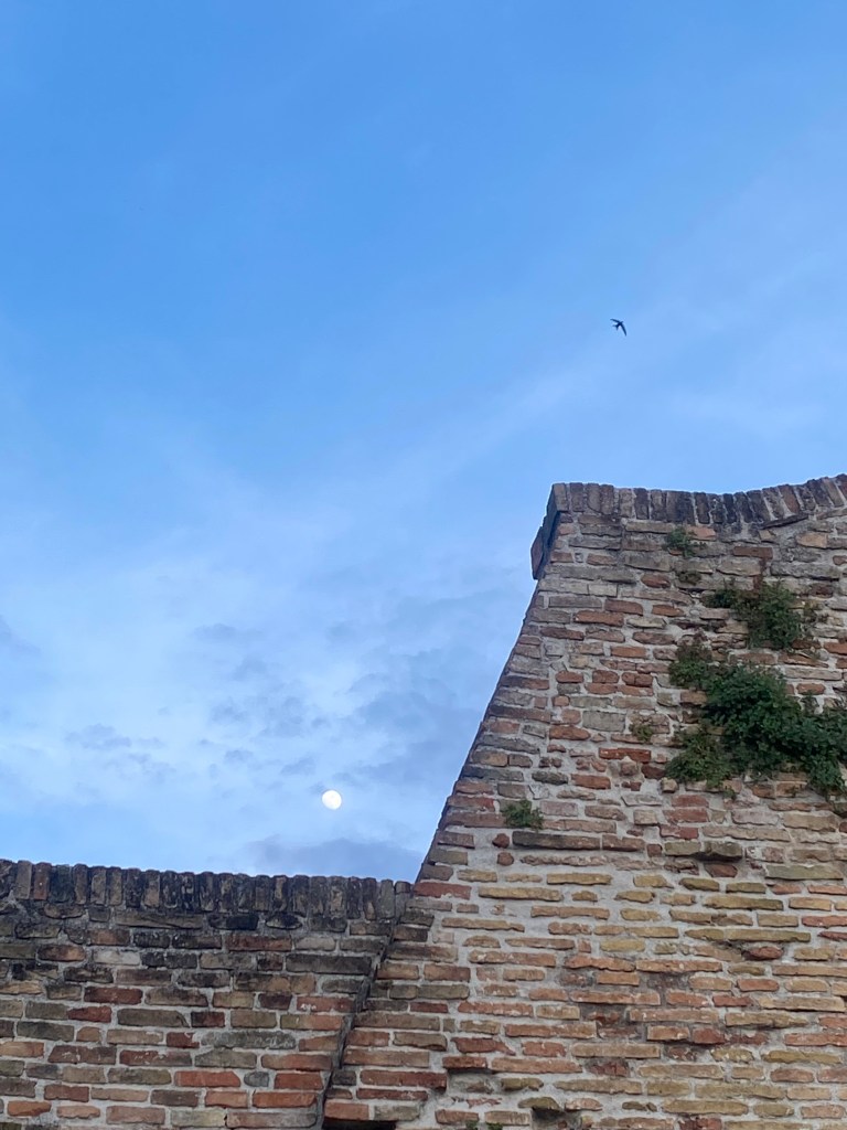 We went out at dusk to look for the moon. “Sunset” in Italian is tramonto, “between” and “mountain,” and we imagine the sun somewhere between the Apennines and the sky behind us far to our west. We were walking east toward the sea, looking for the moon to rise there behind the fringe of Renaissance-painting clouds. (The days have been cloudless blue since we arrived in Fano on Friday.)