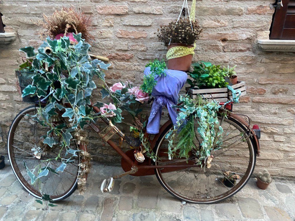 But we’re getting in the spirit of strolling senza fretta, no hurry. Earlier, we walked to the beach of beautifully smooth pebbles. Walking back to our apartment on Via Arco D’Augusto, we listen for bicycles, motorcycles or little cars coming up the narrow streets behind us. We walk straight, or press against a building on the side. We exchange “buona sera” or “salve” to other walkers. We feel a little more a part of the other Fanese on their passeggiate, these little walkabouts.